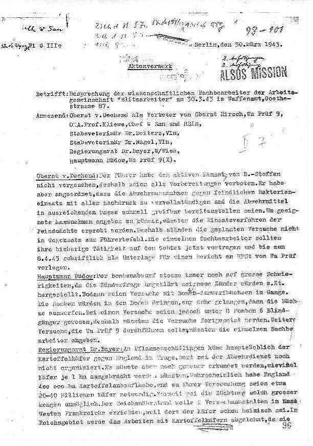 Deutsche entdecken im französischen BW-Institut Pläne zum Einsatz von Kartoffelkäfern und anderen biologischen Kampfmitteln und nehmen selbst - begrenzte - Biowaffenaktivitäten auf.