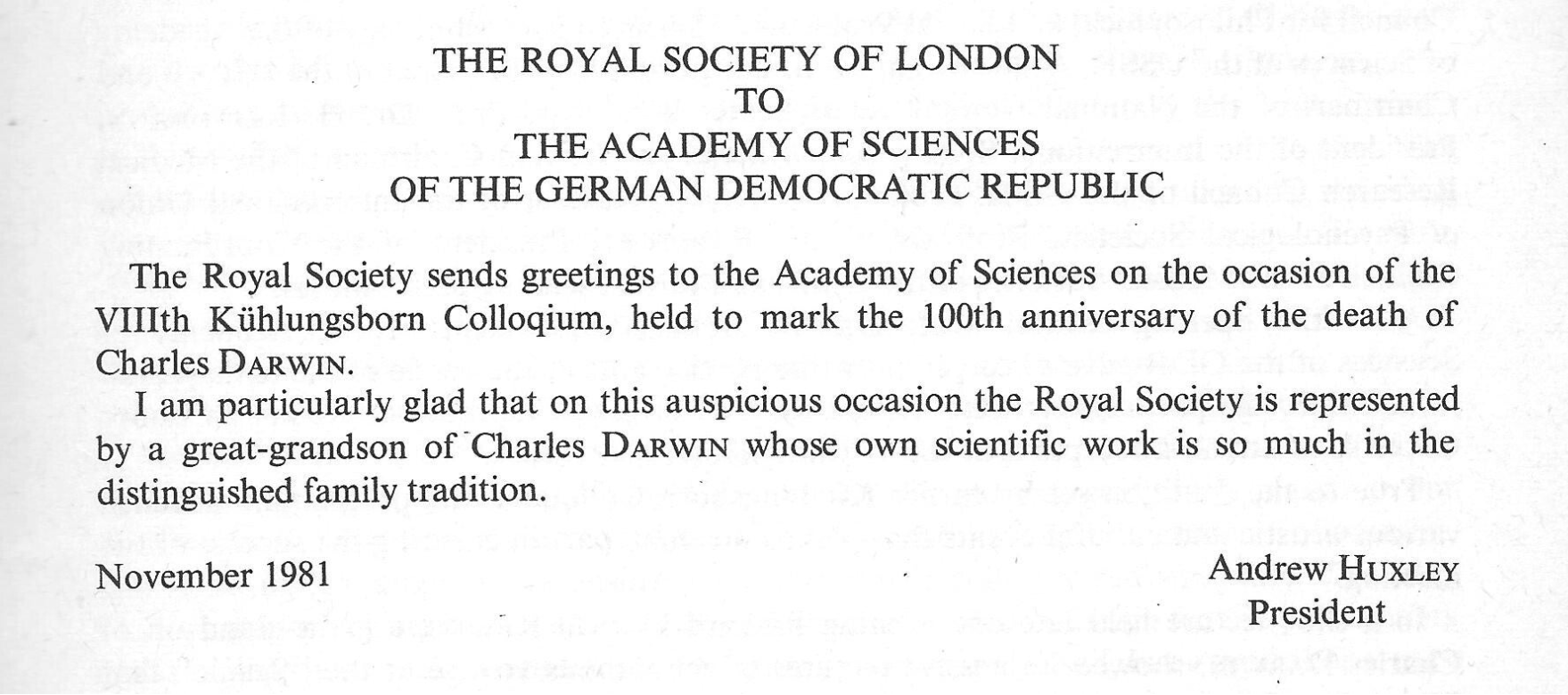 überreichte Darwins Urenkel Richard Darwin Keynes ein Portraitfoto seines Urgroßvaters und eine Grußadresse der Royal Society
